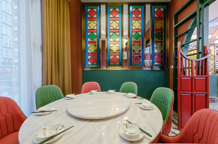 餐飲全案設計思維中,餐飲家具設計也是全案設計的一個重要組成部分:比如除了基本的色調要與品牌主色保持一致之外,家具的款項與品牌之間是否有邏輯關系?家具選用的材料,皮還是布料?既讓顧客坐起來舒服又能與品牌息息相關。我們全案策劃設計的悅得閑廣式點心茶樓,家具顏色就是與整個品牌色調一致的紅和綠,而家具的座椅靠背的圖案造型則與品牌所要傳達的廣式飲茶文化一脈相承。