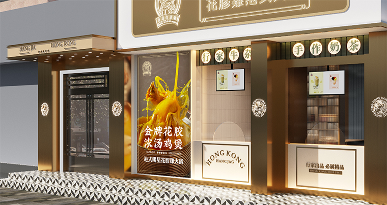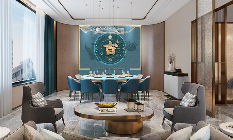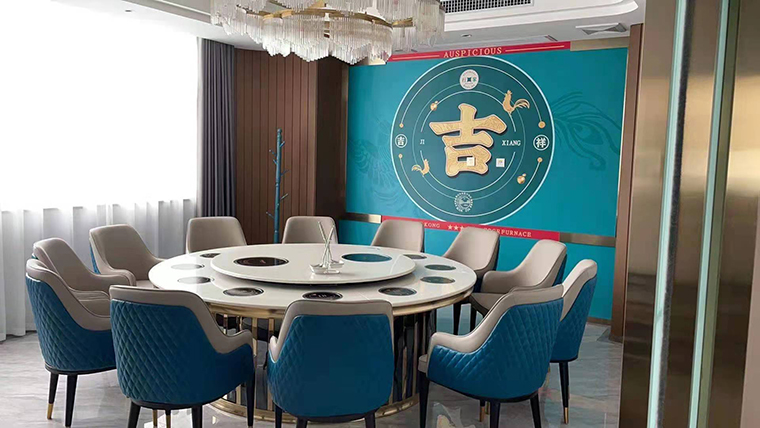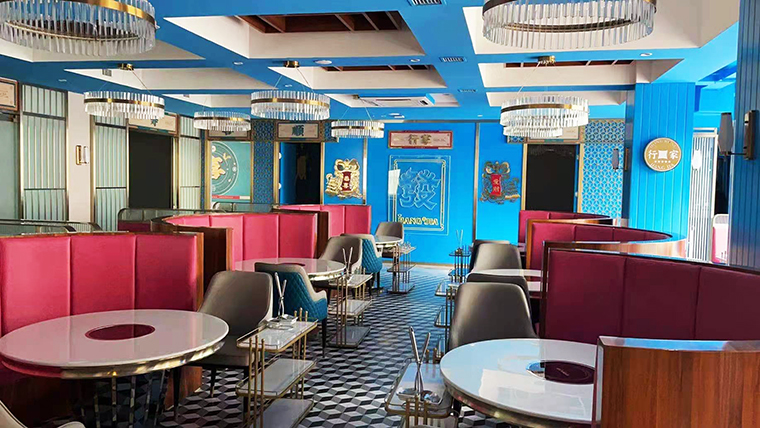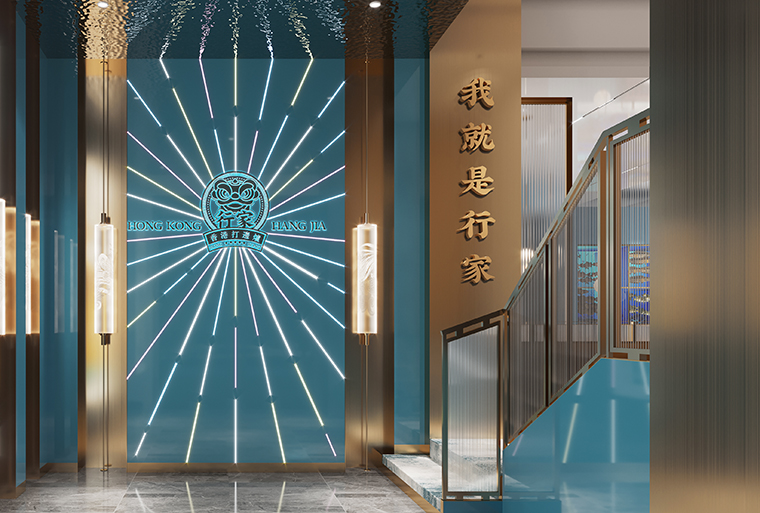 行家花膠雞港式打邊爐餐廳在顏色設(shè)計上結(jié)合品牌色,大面積使用不銹鋼金色,藍綠色,暗紅色,將餐廳打造成主題風格截然不同的港式餐廳,同時融入具有地域風情的港式風味,在文化元素上植入恭喜發(fā)財,順、發(fā)、喜等傳統(tǒng)香港吉祥話語元素,傳統(tǒng)與現(xiàn)代的元素融合在餐飲空間中,突破了人們對傳統(tǒng)港式餐廳的認知,重新定義新派港式打邊爐餐廳的基調(diào)。