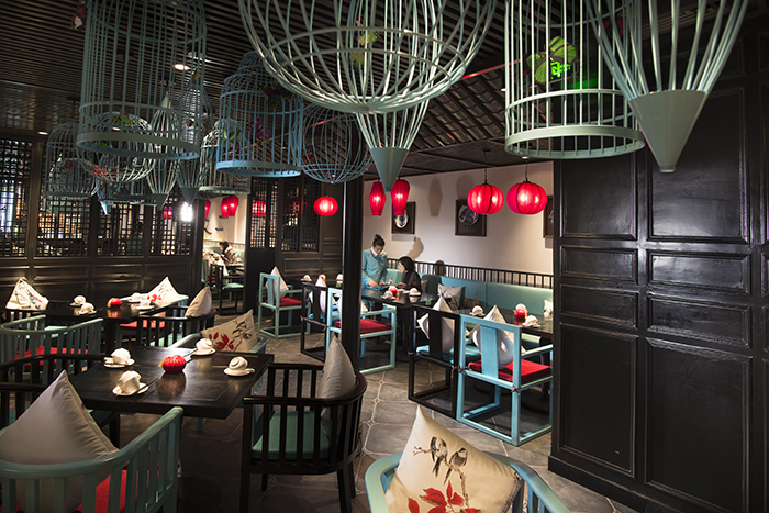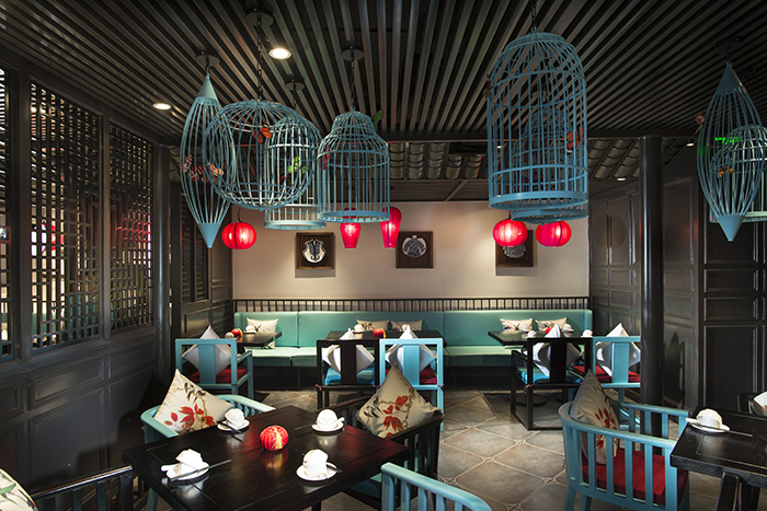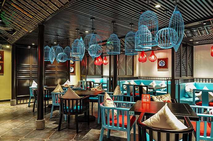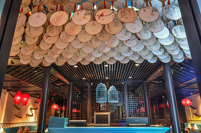 有了識(shí)別度高的平面形象,我們更要有強(qiáng)烈的有鮮明的主題風(fēng)格,或清新、或時(shí)尚歡快的空間裝飾,所以在空間設(shè)計(jì)上,我們充分依托中式風(fēng)和蘇繡元素。