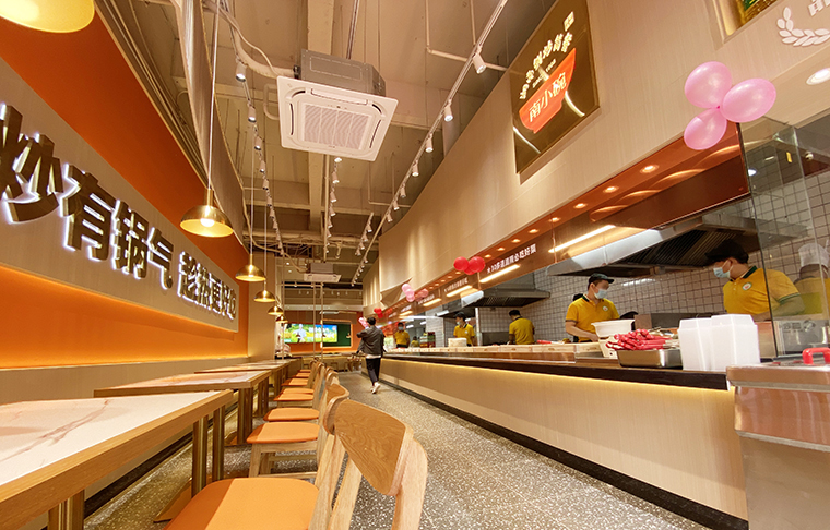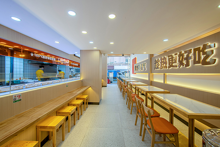 門口大面積落地玻璃、墻面使用板材、白色大理石打菜臺、灰色地面、木色桌面,橙色亞克力板。整個空間追求明亮、整潔、舒適的視覺感受。尤其是門口的落地玻璃,窗明幾凈,讓路過的消費者都能看見店內熱火朝天的狀態,鍋氣繚繞的煙火氣,產生強烈的進店沖動。