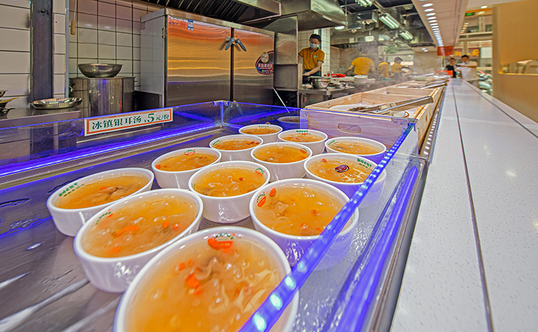 顧客進門洗手,取餐盤自助選菜,找位置就餐,餐具回收,整個動線清晰流暢,運作一氣呵成。選菜臺的設計非常驚艷,30多到菜品排列成一行,在燈光照射,非常有吸引力。讓消費者產生一種想全部吃一遍的沖動,進而胃口大開,長期光顧我們。