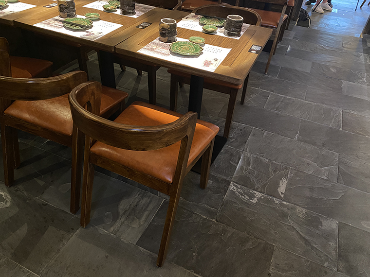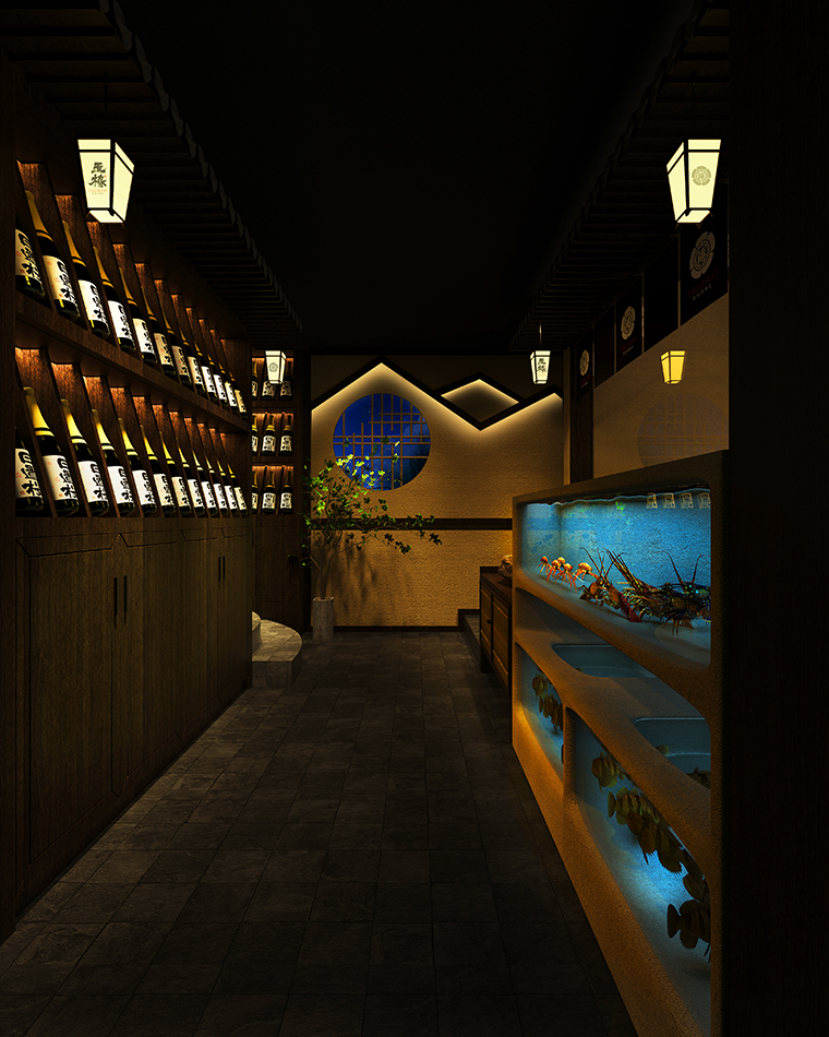 2、一樓大廳及吊頂的設計:把京都的古老街道,巷子搬到我們店里。整個大廳的頂部環(huán)繞一圈日式黑瓦頂,四周幾個日式玻璃木窗,與地面的青石瓦面,墻體的稻草漆,燒烤吧臺形成一體化的京都風格。置身其中,仿佛漫步于京都的古老美食街道中,熙熙攘攘,熱鬧非凡,抬頭間還能看見二樓的日本侍女正在推開窗戶,朝著樓下觀望。