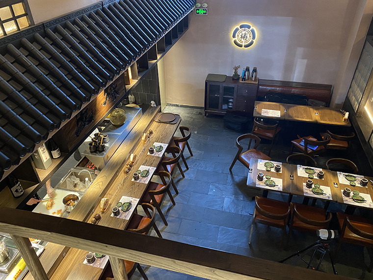為了營造京都風格的空間感受,品深餐飲為玉椿設計定制的家具采用了實木材質,開放漆做舊工藝處理,呈現出一種江戶時代的歷史滄桑質感;與門店的招牌匾額,儲存柜顏色完全一致,顧客使用時候的歷史體驗感更為強烈。