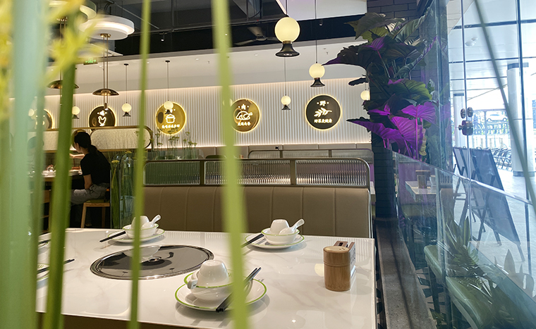 我們想到了磨砂玻璃這一材質,在餐廳立面的隔斷、包間的墻體,我們使用了磨砂玻璃及玻璃方磚,這種材料在燈光照耀下,有一種晶瑩剔透的感覺,用裝飾材料特性表現菜品清湯這一核心特征,打造出時尚清新,通透舒適的空間感受。