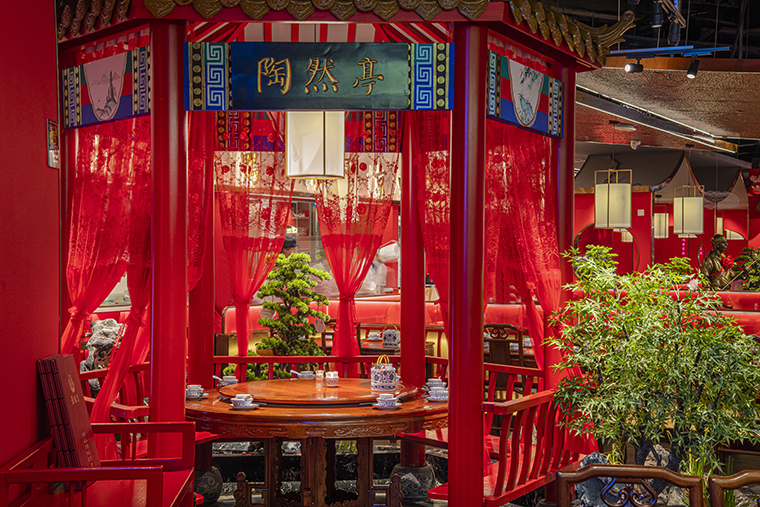 1、本項目為京味張東莞大朗碧桂園里悅里店,總面積約829平方米。用中國紅強化品牌內含的北京皇城文化,令人印象鮮明;