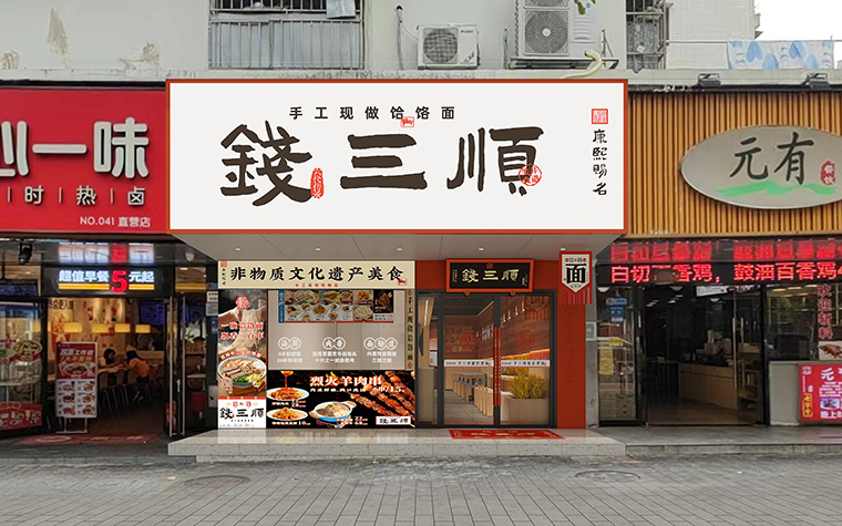 1、從門頭設(shè)計到門面設(shè)計表達,整個門店設(shè)計的重心:手工現(xiàn)做饸饹面,這是我們產(chǎn)品的靈魂,也是我們區(qū)別于其他連鎖面館產(chǎn)品的核心。康熙賜名,是品牌故事的傳說,也是饸饹面權(quán)威背書的一種方式。與門口張貼的非物質(zhì)文化遺傳美食相呼應(yīng),讓消費者對饸饹面有了認知,對錢三順品牌肅然起敬;